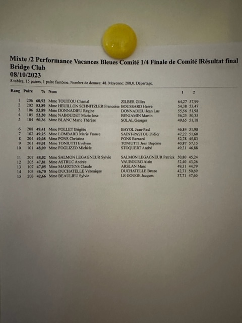 Télécharger le document pdfRésultat Compétition du 8 octobre 2023 - Mixte/2 Performance Vacances bleues Comité 1/4 finale